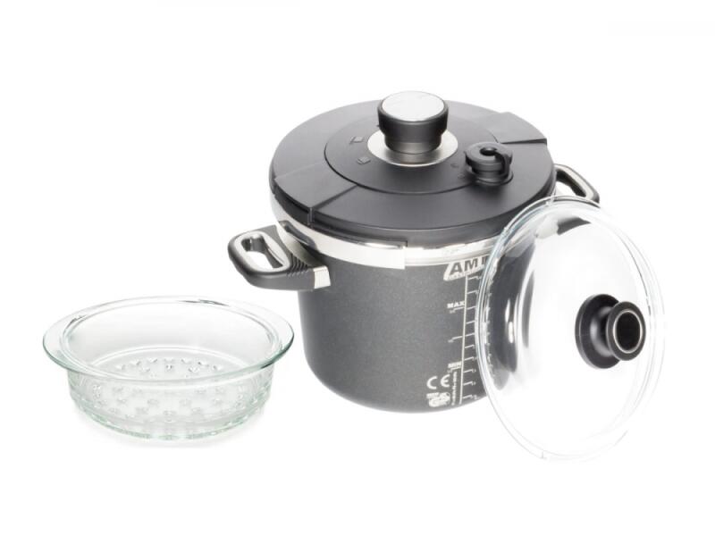 Titán felületű 5,5 l kukta indukciós, pároló edénnyel Az AMT titán kukták számos biztonsági funkcióval vannak ellátva. Akár egy kézzel és nagyon könnyen kezelhető biztonsági rendzer. A fedőn lévő acél rögzítők biztonságosan kapaszkodnak a fazék masszív széléhez, ami kiküszöböli a fedél bármilyen lehetőségét az edényről való eltávolodásának. Nyomásszint