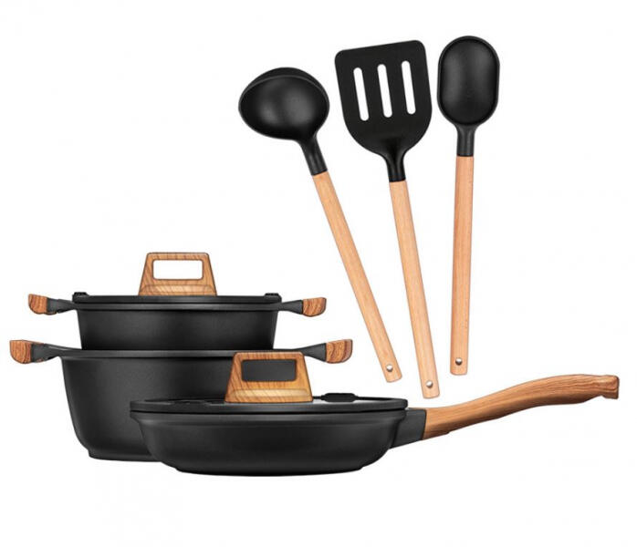 Stílus és funkcionalitás tökéletes harmóniában A Smile MGK-23 Fa-Fekete edény- és eszközszett mindent magában foglal, amire szüksége lehet a hatékony és kényelmes főzéshez. Ez a 8 elemes készlet elegáns fa-fekete színével és prémium minőségű anyagaival emeli konyhája stílusát. Minőség és tartósság együtt Az öntött alumínium edények és serpenyő kiváló min