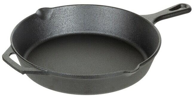 Serpenyő, öntöttvas, fogantyú, átmérő kb. 30 cmhosszabbított fogantyú, felfüggesztőszemmel kb. 12 cmrövid ellentétes fogantyú kb. 3 cm2 kiöntőcsőFenék átmérője: kb. 25 cmMéretek: kb. 32,5 x 6,5 cm (Di x H)Súly: kb. 3,1 kgMaterial: Anyag: 100 % öntöttvas