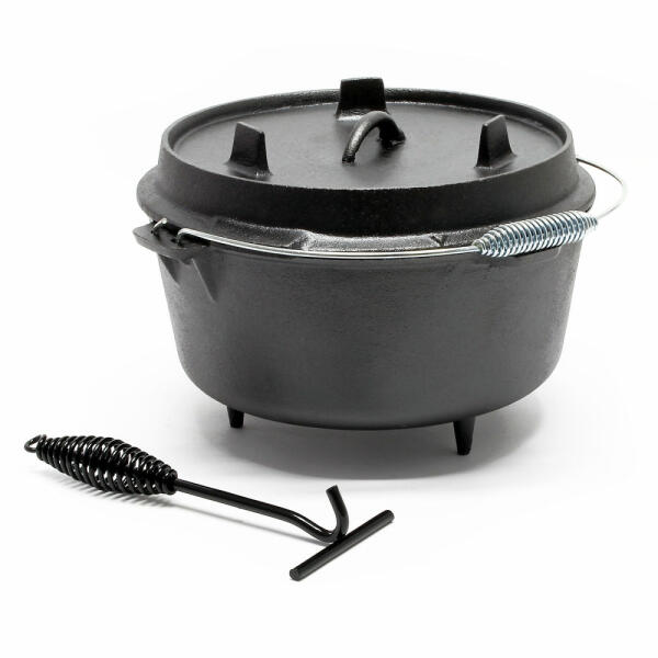 Ez a hozzáillő fedővel ellátott öntöttvas holland sütő tökéletes edény a kültéri konyhában. Akár állandó tűzrakóhelyen, akár tábortűzön, akár grillsütőn, a 8 literes főzőedénnyel a kinti ételkészítést a normál grillezésen túl is bővítheti. A Dutch Oven lábakkal rendelkezik a biztonságos állvány érdekében, így egyenetlen felületeken is stabil. A holland