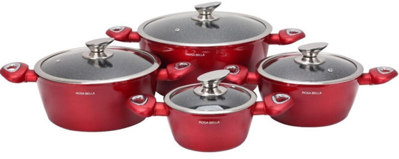 Ez a gyönyörű Rossa Bella edénykészlet a legszigorúbb német szabványok szerint és a legjobb alumíniumból készül. Az alját nem kevesebb, mint 3 réteg márvány borítja, gyönyörű fekete belsővel, amely nem színeződik el. A vastag talpnak köszönhetően az edények nagyon tartósak és az étel egyenletesen melegszik fel. A serpenyők főzőlapon és indukciós tűzhelyen is ha