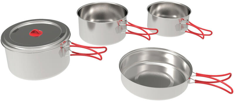 Gyönyörű és stabil családi főzőkészlet 3 edénnyel, serpenyővel és fedővel. Szilikonbevonatú összecsukható fogantyúk a jó kezelhetőség és a helytakarékos szállítás érdekében. Minden edény dombornyomott töltöttségi szintjelzővel rendelkezik. A fedél szitaszerű szűrőnyílással rendelkezik. Hálós