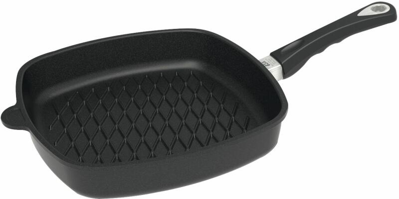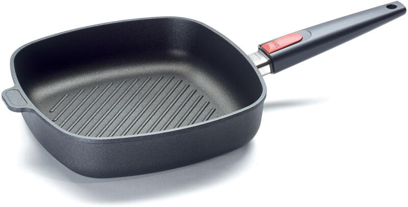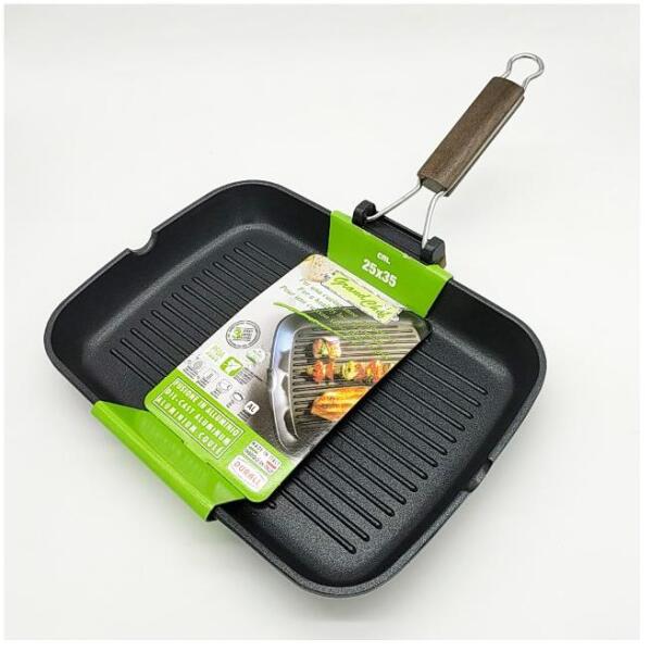 GrandChef tapadásmentes grillsütő lehajtható fogantyúval 25 x 35 cm Aluminium öntvény tapadásmentes Durall bevonattal Behajtható fa-acél foganytyúval Alján bordázott, szép csikokat süt a húsba Két oldalán olajkiöntővel Ha nincs használatban, a fogantyút behajtva kis helyet foglal Elektromos, kerámia és gáz főzőlapon használható, inukcióson nem