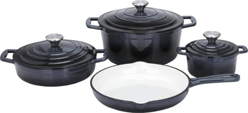 KOCH SYSTEME XANTEN, 7 részes kiváló minőségű zománcozott öntöttvas edény készlet. 4 mm anyagvastagság. Fehér zománcozott belsővel a könnyebb karbantartásért és tisztán tartás érdekében. Hosszan tartó hőhatás. Ideális sütésre, főzésre és akár tálalásra is. Sütőben is használható. Minden főzőfelületre: indukciós, kerámia, gáz, elektromos. PronamelPlus te