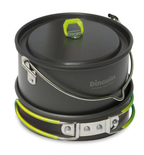 Kemping étkészlet öt-nyolc személy számáraEloxált felületű alumíniumból készült kempingedénykészlet. Az összecsukható fogantyúk acélhuzalból készültek, szilikon hőálló csővel, a poharak fogantyúi műanyagból készültek. Az eloxálás (más néven Eloxálás) egy nagyon erős és kemény alumínium-oxid