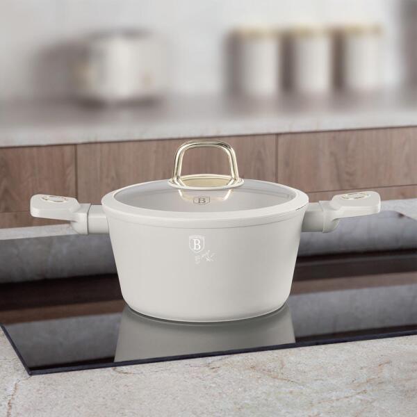 Berlinger Haus tapadásmentes lábas fedővel, 20 cm, Sahara - BH-8070 Fedezze fel a Berlinger Haus Sahara sorozatának elegáns és praktikus 20 cm-es lábasát! Ez a modern edény kiváló minőségű kovácsolt alumíniumból készült, három rétegű titánPro bevonattal, amely rendkívül tartós és tapadásmentes. A 2,5 literes űrtartalmú lábas ideális választás a mindennapi főzésh