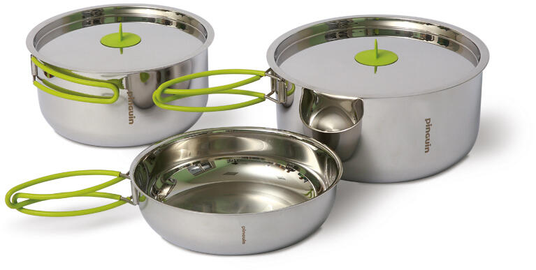 Rozsdamentes acélból készült, három-öt személyes kempingedénykészlet. Az összecsukható fogantyúk acélhuzalból készültek, amelyek hőálló szilikonnal vannak bevonva. A poharak fogantyúi szintén szilikonból készültek. Az edényeken lévő logók és térfogatvonalak lézergravírozással vannak jelölve,