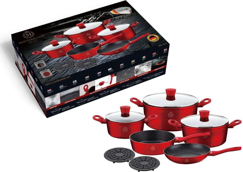A Meisterklasse Exklusiv MK-1015 edénykészlet egy kiváló minőségű 10 darabos szett, amely kiváló választás lehet a konyhai tevékenységekhez. A szett tartalmaz 2 serpenyőt fedő nélkül, valamint 2 serpenyőt fedővel, minden edény márvány belsővel és hőálló üveg fedővel ellátva. Az edények anyaga alumínium, ami hővezető tulajdonságokkal rendelkezik, így egyenletesen