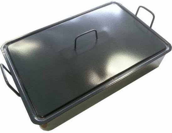 Nagyméretű zománcozott tepsi rozsdamentes acél fogantyúval.