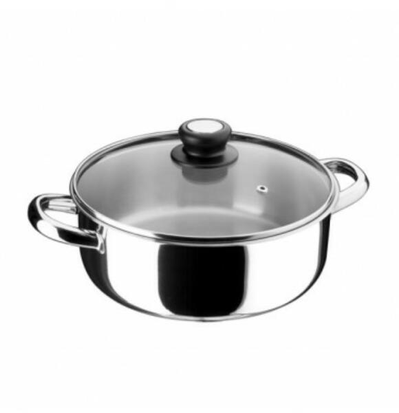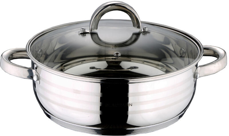 Berghome Line rozsdamentes edény üveg fedővel 24 x 14,5 cm 5,5 L Kiváló minőségű rozsdamentes acél. Hőtartó alj: 5 rétegű hővezető. Minden fajta tűzhelyen használható: elektromos, gáz, indukciós, kerámialapos készülékeken. Mosogatógépben is mosható. Az étel gyorsan felmelegszik, az edény kiválóan tartja a meleget. A praktikus öntőkarimának köszönhetően nincs cs