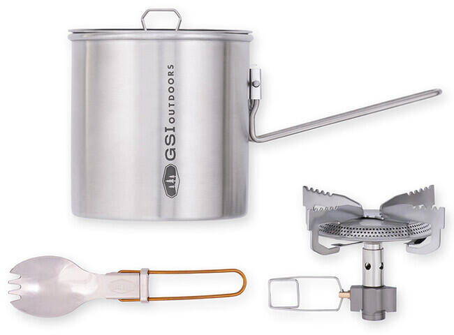 et 1,1l GSI Glacier Stainless Boiler, GSI Glacier Camp Stove és GSI Glacier összecsukható sporka, mind prémium 18/8 rozsdamentes acélból (304) készült. Az egész szett olyan praktikusan összecsukható a főbojlerbe, hogy a GSI Isobutane Fuel 230g-os gázpatronja is elfér benne, ami nem tartozék.