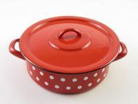 Bonyhádi pöttyös zománcozott lábas + fedő 22 cm Tulajdonságok: Az edény kívül-belül zománc bevonatos. Űrtartalma: 2,75 literes Belső átmérője: 22 cm Külső átmérője: 24 cm Lábas színe: kívül piros alapon fehér pöttyös Fedő színe: fehér, piros Mosogatógépben mosható.