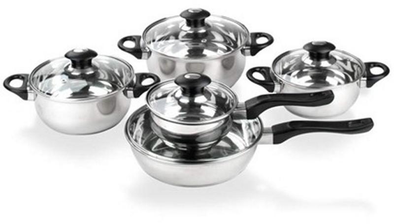 Banquet Rozsdamentes acél edénykészlet, 10 db A Banquet rozsdamentes acél edénykészlet 4 db edényből és 1 serpenyőből tevődik össze, melyekhez üvegfedő is tartozik. Minden típusú tűzhelyen használható beleértve az indukciós főzőlapot is. Megbízható, minőségi anyagokból készültek, melyek egy életen át fogják segíteni a főzésben. A Banquet Rozsdamentes acél edé