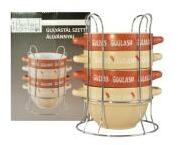 Perfect Home Gulyástál szett 4db-os, állvánnyal (15701) Anyaga: kerámia, krómozott fém Mérete: doboz mérete: 17,5*17,5*24 cm Tartalma: 4 db gulyástál, 1 db állvány Gulyástál magassága: 9,5 cm, szélessége füllel: 18,5 cm, átmérője: 14 cm. Szett magassága állvánnyal: 23,5 cm, szélessége: 16 cm Űrtartalma: 0,75 l Bruttó súlya: 2,48 kg Nettó súlya: 2,4 kg Tisztítása: