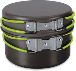 A készlet alumíniumból készült, eloxált felülettel. Az összecsukható fogantyúk acélhuzalból készültek, szilikon hőálló csővel. Az eloxálás (más néven Eloxálás) egy nagyon erős és kemény alumínium-oxid réteget hoz létre az anyag felületén, amely megakadályozza a további oxidációt, növeli az