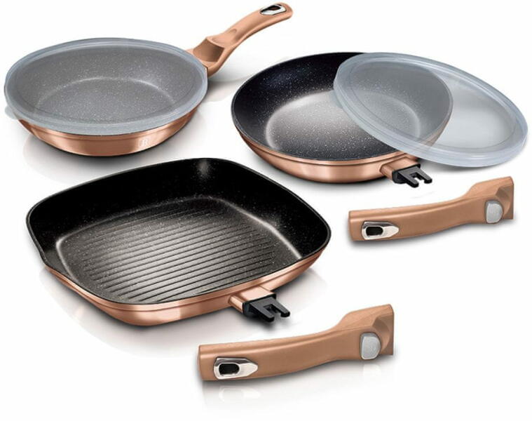 Gyártó: Berlinger Haus Modell: Metallic Line Rose Gold Edition 5 pcs (BH/7038) A BerlingerHaus 5 részes serpenyő szett levehető nyéllel a Metallic Line Rose Gold Edition termékcsalád tagja, ami eleganciát és funkcionalitást is kínál a konyhában. A kovácsolt alumíniumból készült serpenyők kiváló hőeloszlást biztosítanak, és a levehető nyélnek köszönhetően praktikusak
