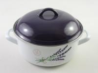 Bonyhádi X Alice zománcozott lábas magas+fedő 24 cm, levendula mintás A Bonyhádi Alice lábas praktikus és esztétikus választás minden konyhába. Az elegáns, levendula mintás zománcozott edény a vidéki konyhák báját idézi, miközben a modern igényekhez igazodik. A következő jellemzőkkel rendelkezik: Átmérő: 24 cm Magasság: (fedő nélkül megadva) 11 cm Űrtartalom: 3,75