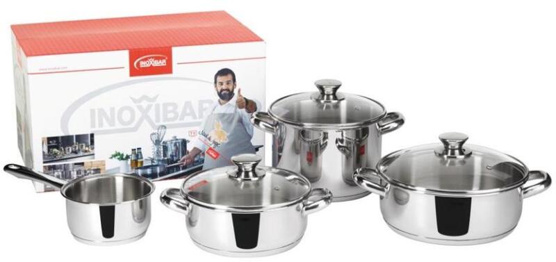 Inoxibar Prémium kategóriás rozsdamentes edényszett 7 részes. 18/10 A szett tartalma: rozsdamentes fazék 20 x 14 cm átmérő fedővel, lábas 20 x 8 cm átmérő fedővel, lábas 24 x 9 cm átmérő fedővel, nyeles szószos edény 14 x 7 cm Prémium kategóriás edény szett, Spanyolországban gyártva. Használható minden főzőfelületen: indukciós, kerámia, gáz, elektromos stb. Moso