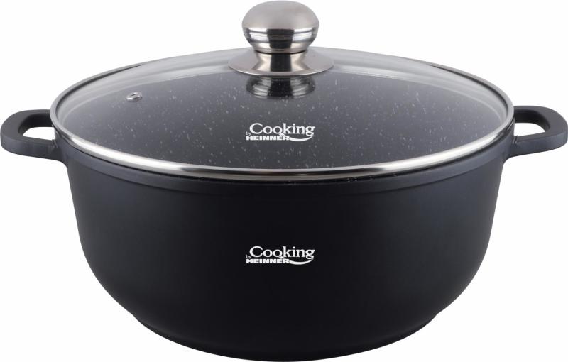 Cooking by Heinner Dark Line Alumínium fazék fedővel, indukció, 28x12.5 cm, 6.5 L Belső tér: kerámia, külső, magas hőmérsékletnek ellenálló festék, fekete. Alkalmas alap az indukcióhoz; Alumínium fogantyúk levehető szilikonvédelemmel. A termékek öntött alumíniumból készülnek tapadásmentes kerámia bevonattal, fekete márványból, ezáltal a termék hosszabb ideig megő