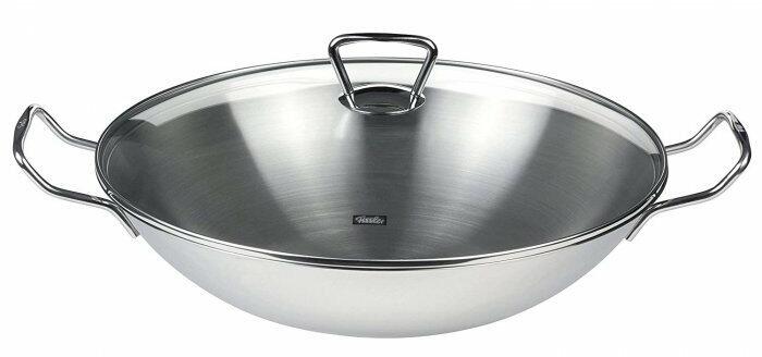 A Fissler Wok 35 cm, rozsdamentes acélból 18/10 készült . Woknak a matt felületnek és a magas üvegburkolatnak köszönhetően figyelemre méltó. A wok minden főzési módszerhez használható, például zöldségek gyors sütéséhez, hús, hal, szoté vagy tészta sütéséhez.