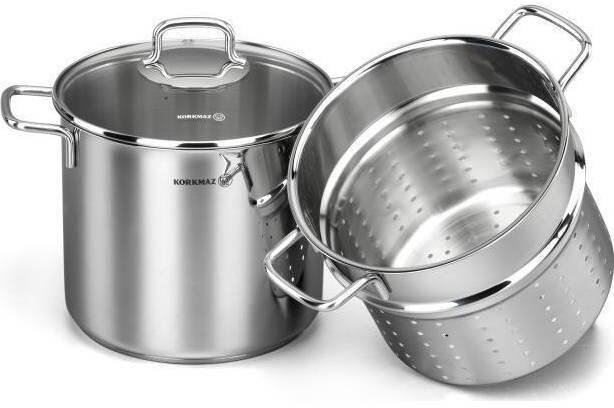 Minőségi rozsdamentes acél tésztafazék 5 literes űrtartalommal, gőzölőbetéttel és üvegfedővel.