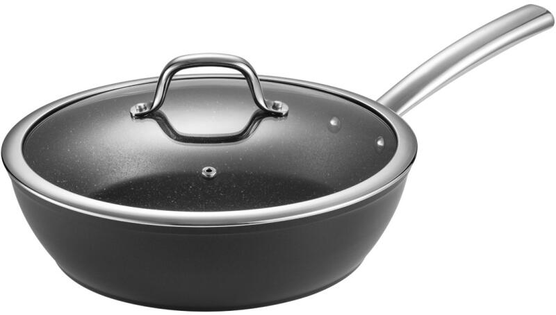 Mély indukciós serpenyő, speciális, strukturált tapadásmentes bevonattal. Miben kiemelkedő a PRESIDENT mély serpenyő fedővel? A fedővel ellátott mély serpenyő indukciós főzőlapokhoz készült, és a belsejében egyedülállóan strukturált tapadásmentes bevonat található, amely a természetes, csiszolatlan kő jellegét idézi. A serpenyő speciálisan struktúrált felületé