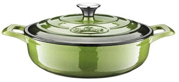 Sütőtál tulajdonságai: Anyaga: öntött vas, kívül-belül zománcozott Méretei: 28 cm átmérőjű, 7,5 cm magas Űrtartalma: 3,5 liter szín: zöld, belső része krémszínű Bruttó súlya: 6,24 kg Nettó súlya: 6,04 kg Használható: szabad tűzön, gáz-, elektromos és indukciós tűzhelyen, sutőben Tisztítása: Semleges folyékony mosogatószerrel mossa el! Kerülje a karcosodást