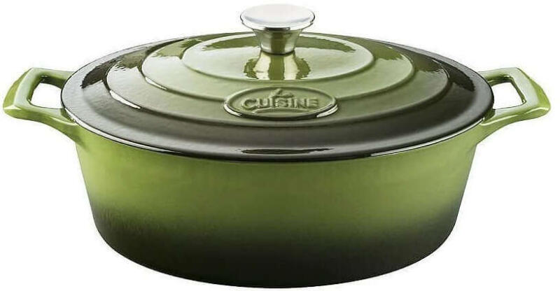 Zománcozott öntöttvas ovál lábas fedővel 26 cm zöld: Tartós és stílusos lábas, melyet zománcozott öntöttvasból készítettek. Kiváló hőelosztással rendelkezik, így egyenletesen főzhetünk benne. A fedő segít megtartani az ízeket és a nedvességet. A zöld szín elegáns megjelenést kölcsönöz a konyhának. Ideális választás minden házi szakács számára.