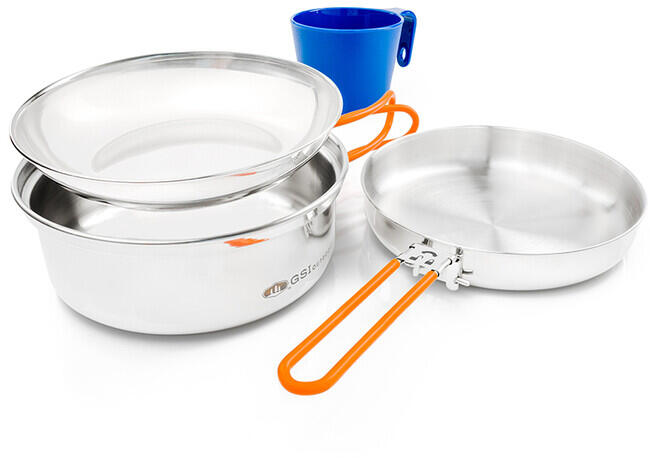 1 személyes edénykészlet kiváló minőségű, mechanikusan ellenálló 18/8 rozsdamentes acélból. A készlet egy 1 literes, összecsukható fogantyúval ellátott edényből, egy 16 cm átmérőjű serpenyőből és egy 355 ml-es bögréből áll. A készlet a helytakarékosság érdekében könnyen összecsukható, és a