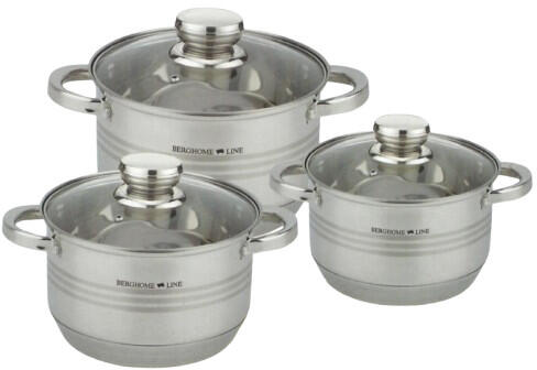 A Berghome Line 6 részes rozsdamentes edénykészlet tökéletes választás mindazok számára, akik minőségi, tartós és könnyen használható edényeket keresnek. A készlet három különböző méretű lábost tartalmaz, mindegyikhez hőálló fogantyúval ellátott üvegfedő tartozik. Az edények 7 rétegű hővezető aljának köszönhetően a hő gyorsan és egyenletesen oszlik el,