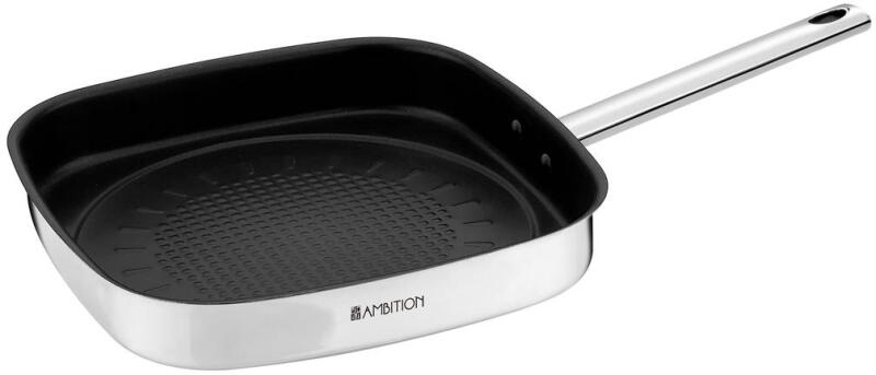 Az Ambition Maestro grillserpenyője a legjobb minőségű rozsdamentes acélból készült. A kiváló minőségű rozsdamentes acél garantálja a használat biztonságát és a higiéniát. A serpenyő belsejét az eredeti Swiss ILAG Ultimate bevonat borítja. Ez egy rendkívül tartós bevonat kiváló tapadásmentes tulajdonságokkal és a legmagasabb karcállósággal. Az edény falainak vas