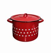 Bonyhádi pöttyös zománcozott fazék + fedő 24 cm Tulajdonságok: Az edény kívül-belül zománc bevonatos. Űrtartalma: 7,5 literes Belső átmérője: 24 cm Külső átmérője: 26 cm Lábas színe: kívül piros alapon fehér pöttyös Fedő színe: fehér, piros Mosogatógépben mosható.