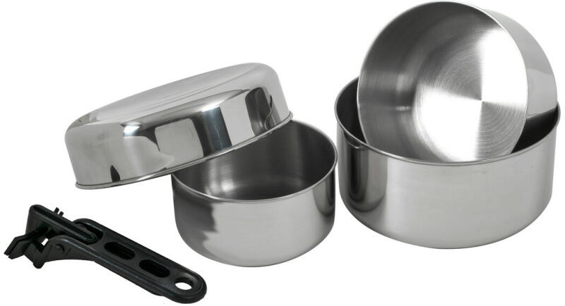 2 személyes főzőkészlet nyaraláshoz, szabadtéri, kempingezéshez vagy 4 személyes főzőkészlet rövid pihenéshez és súlymegtakarításhoz. Rozsdamentes acélFőzőkészletSúly 770 gEdény 1,8 l, o kívül 18,5 cm, belül 17,5 cm, H 8,3 cm, 230 gEdény 1,1 L, o kívül 15,5 cm, belül 15,0 cm, H 7 cm
