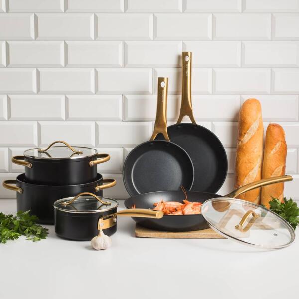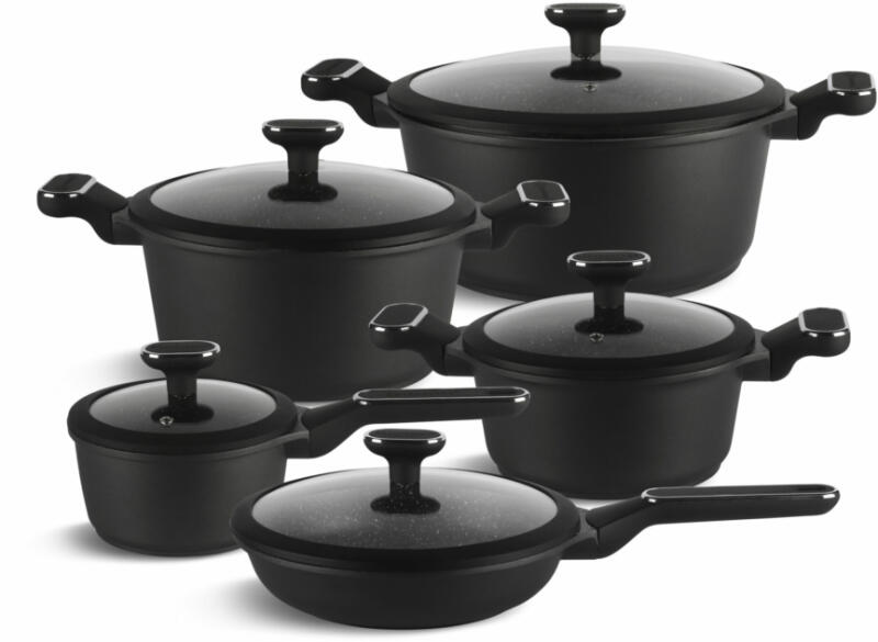 Anyaga: préselt alumínium Bevonat: kerámia-márvány bevonat, tapadásmentes bevonat, PFOA mentes A könnyű kialakítás kiváló hővezető képességet biztosít Ellenáll a karcolásnak és a magas hőmérsékletnek Fogantyú Soft touch bevonattal Levehető szilikon perem, könnyen tisztítható Edzett üvegből készült fedők gőznyílással Minden típusú tűzhelyhez alkalmas, beleért
