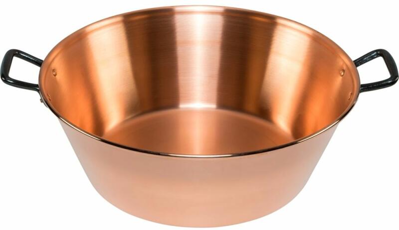 Hagyományos lekvárfőző edény rézből, szegecselt öntöttvas fogantyúkkal. Ideális lekvárok készítéséhez. A réz a legjobb hővezető: egyenletes eloszlás és ideális hőátadás. Lehetővé teszi a főzési környezet jobb szabályozását. Megőrzi a gyümölcs természetes színét: a lekvárok nem barnulnak meg. Nagy lapos fenék: nagyon stabil még gázégőn is. Az oldala és