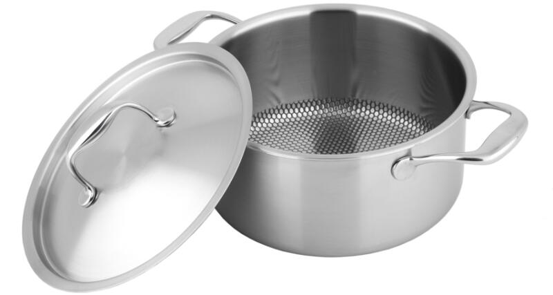 Dresden rozsdamentes lábas dombornyomott aljjal rozsdamentes fedővel 20*10 cm, 2 L, 18/10. Mit jelent a 18/10 rozsdamentes acél? Ez az anyag összetétele: acél, 18% króm és 10% nikkel. Azok a rozsdamentes termékek, amelyek ebben az összetételben készülnek jobban ellenállnak a korróziónak és jobb a minőségük. A Dresden kiváló minőségű tripla anyagból készült, amely biztos