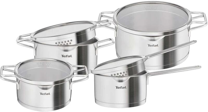 Nyolc részes lábas készlet Üveg fedő Rozsdamentes acél Két darab tésztaszűrő betét Tefal Nordica edénykészlet: Okos formaterv Az északi országok életstílusa a Tefal Nordica készlet egyszerű esztétikájában nyilvánul meg, amelyre a tiszta és minimalista vonalak és az átgondolt dizájn jellemző. Ez az alapvető rozsdamentes edénykészlet ideális a finom és bőséges éte