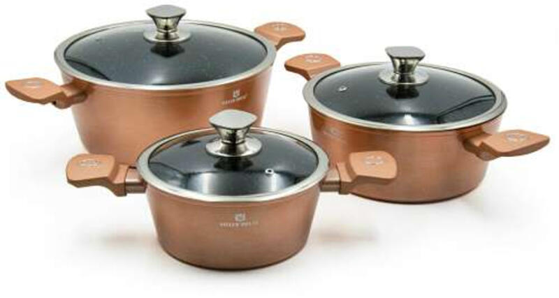 Nanotechnológiai eljárással készült, tapadásgátló bevonattal ellátott 6 elemes edényszett, gránitpor (márványutánzó) keverékével, rendkívül sűrű, kompakt és sima réteget hozva létre a felületen. Anyaga: préselt alumínium Bevonat: kerámia-márvány bevonat, tapadásmentes bevonat, PFOA mentesMinden típusú tűzhelyhez és főzőlaphoz alkalmas edények. Az indukciós f