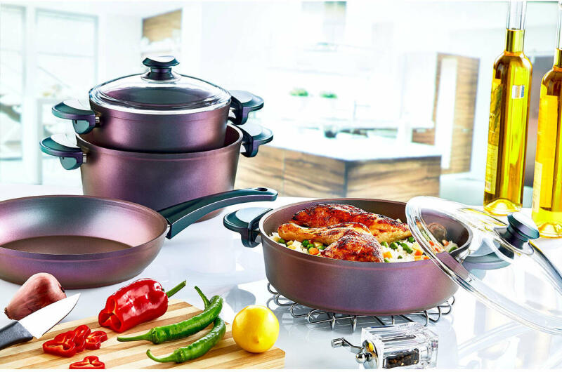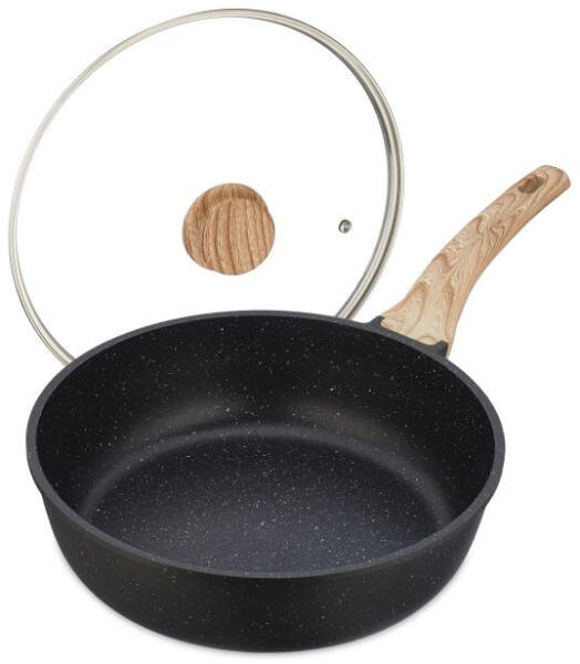 Tapadásmentes serpenyő magas peremmel Ezzel a serpenyővel finom, aromás pörkölteket varázsolhat. A nagy pároló, magas peremű serpenyő elegendő helyet kínál, és ideális a hús és zöldség kíméletes elkészítéséhez. Az indukciós serpenyő erős alumíniumból készül, amely egyenletes hőeloszlást biztosít. A márványbevonatnak köszönhetően semmi sem tapad sütés köz