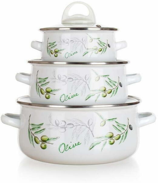 Stílusos zománcozott edénykészlet OLIVES a Banquet-től népszerű olívaágakkal. A készlet 3 edényt és 3 üvegfedelet tartalmaz, műanyag gombbal a kényelmesebb kezelés érdekében. Az edények minden típusú tőzhelyhez alkalmasak.