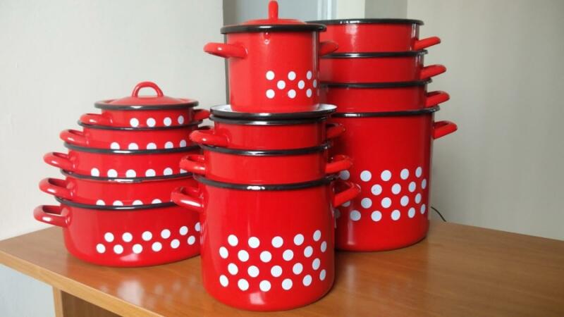 Zománcozott fazék piros pöttyös 8L. Az edény egyenletes és kiváló hőelosztási képességgel rendelkezik, így az étel egyenletesen fő meg. Az edény elektromos, gáz, kerámialapos főzőlapon használható. Vigyázzunk a zománcozott felület épségének megőrzésére, karcosodást okozó eszközzel ne használjuk! Javasolt fakanál, illetve műanyag eszközök használata a kiszed