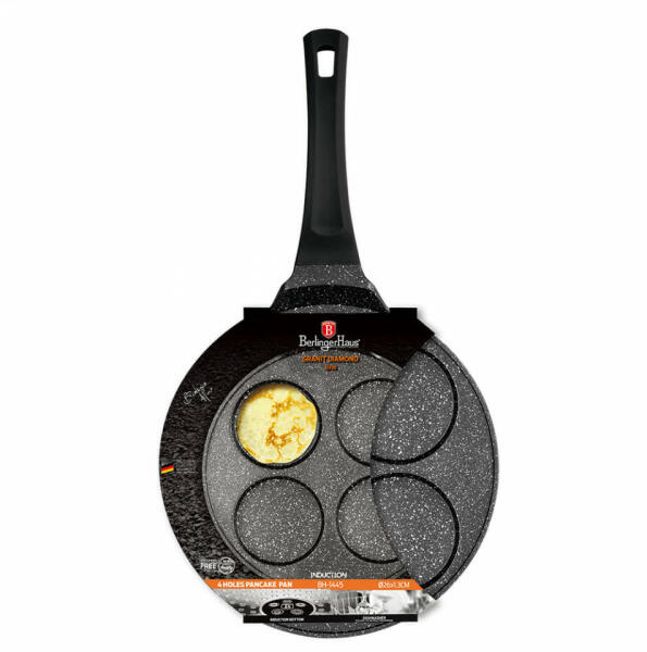 Gyártó: Berlinger Haus Modell: Granit Diamond Line 26 cm (BH/1445) Leírás: Nincs több leragadt tükörtojás, palacsinta! Ezzel a minőségi, Berlinger Haus márvány bevonatú serpenyővel gyerekjáték az aranyos kis palacsinták, és tökéletesen egyenletes méretű tükörtojások készítése! Tulajdonságok: Öntött alumínium 2 rétegű márvány bevonat PFOA, ólom-és kadmiummentes