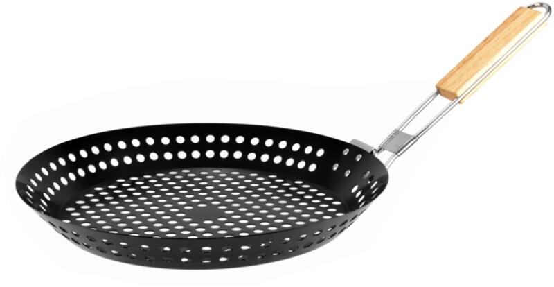 A csomag tartalma:- 1 db BBQ / gesztenyesütő serpenyő 31*3,5 cm Anyaga: acél tapadásmentes bevonattal, fa Mérete: ~31 cm átmérő; 4 cm magas; 26,5 cm nyél hosszúság; 16 cm magas kihajtott nyéllel Súlya: 580 g Tisztítása : Sem leges folyékony mosogatószerrel mossa el! Kerülje a karcosodást okozó szerek és eszközök használatát! Figyelem! A fa nyél gyúlékony! Ne kerüljön