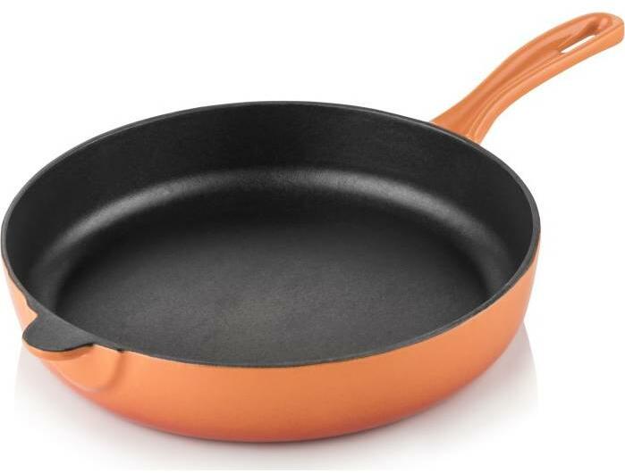A narancssárga öntöttvas serpenyő zománcozott felülettel ideális mindenféle főzéshez. Átmérője 24 cm.