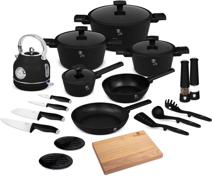 Fedezze fel a konyhai tökéletességet a BerlingerHaus exkluzív konyhai kezdőszettjeivel, amelyek most 5 új, lenyűgöző termékcsalád design-jában érhetők el! Ez a prémium minőségű szett nem csupán funkcionalitásában kiemelkedő, de elegáns megjelenésével is tökéletesen illeszkedik bármely konyhába. A konyhai kezdőszett tartalma: 15 részes edénykészlet: 5 db lábas víz