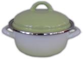 Bonyhádi zománcozott lábas + fedő zöld árnyalt 16 cm (512016078) . A Bonyhádi zöld árnyalt, zománcozott lábas az Alice termékcsalád tagja. A lábas űrtartalma 1,25 liter, átmérője 160 mm, magassága 76,5 mm. Az edénybelső zománcozott felületű, az edény külső részén pedig fehér - zöld árnyalt dekoráció található. A magas fedő is zománcozott fémből, fémfüllel