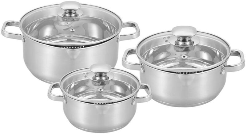 KOCH SYSTEME LEIPZIG, 6 részes rozsdamentes edény készlet kiöntést segítő kialakítással - üveg szűrőfedéllel formatervezett elegáns fogantyúval. Szatén fényű, a belsejében tükör fényes. A szett tartalma: 16 x9 cm, 20 x 11 cm, 24 x 13 cm edények fedővel. Az edények űrtartalma: 1.5L 3.2L 6.0LEnergia takarékos talppal. Minden főzőfelületen használható, indukciós, ker