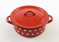 Bonyhádi pöttyös zománcozott lábas + fedő 18 cm magasság: 7 cm belső ármérő: 18 cm külső átmérő: 19,6 cm színe: piros alapon fehér pöttyök használható az alábbi főzőfelületeken: elektromos, gáz, halogén, kerámia mosogatógépben mosható