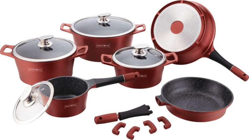 Tulajdonságok: Kiszerelés: 8 db Fő anyag : Alumínium Egyéb anyag : Üveg Egyéb anyag : Bakelit Fogantyúk anyaga : Soft touch A csomag tartalma: Serpenyő Méret/mélység/átmérő cm : 24,00 Magasság cm : 4,50 Fenék vastagsága mm. : 3,70 Fogantyúk anyaga : Soft touch Fogantyúk száma : 1,00 Tál 1 fogantyúval Méret/mélység/átmérő cm : 28,00 Magasság cm : 5,00 Fenék vastagság