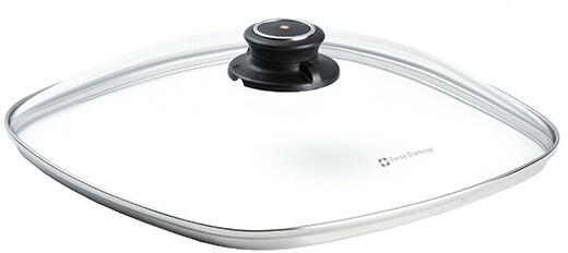 Swiss Diamond® üvegfedő 28x28cm állítható szeleppel Edzett négyszögletes üvegfedő Swiss Diamond® edényekhez, 28x28 cm méretű. A fedél edzett üvegből készült. A tetején egy szeleppel van ellátva, amely könnyen leszerelhető, hogy szükség szerint alaposan ki lehessen tisztítani. A fedő teljesen átlátszó, hogy főzés közben meg tudja nézni mennyire van az étel átsül